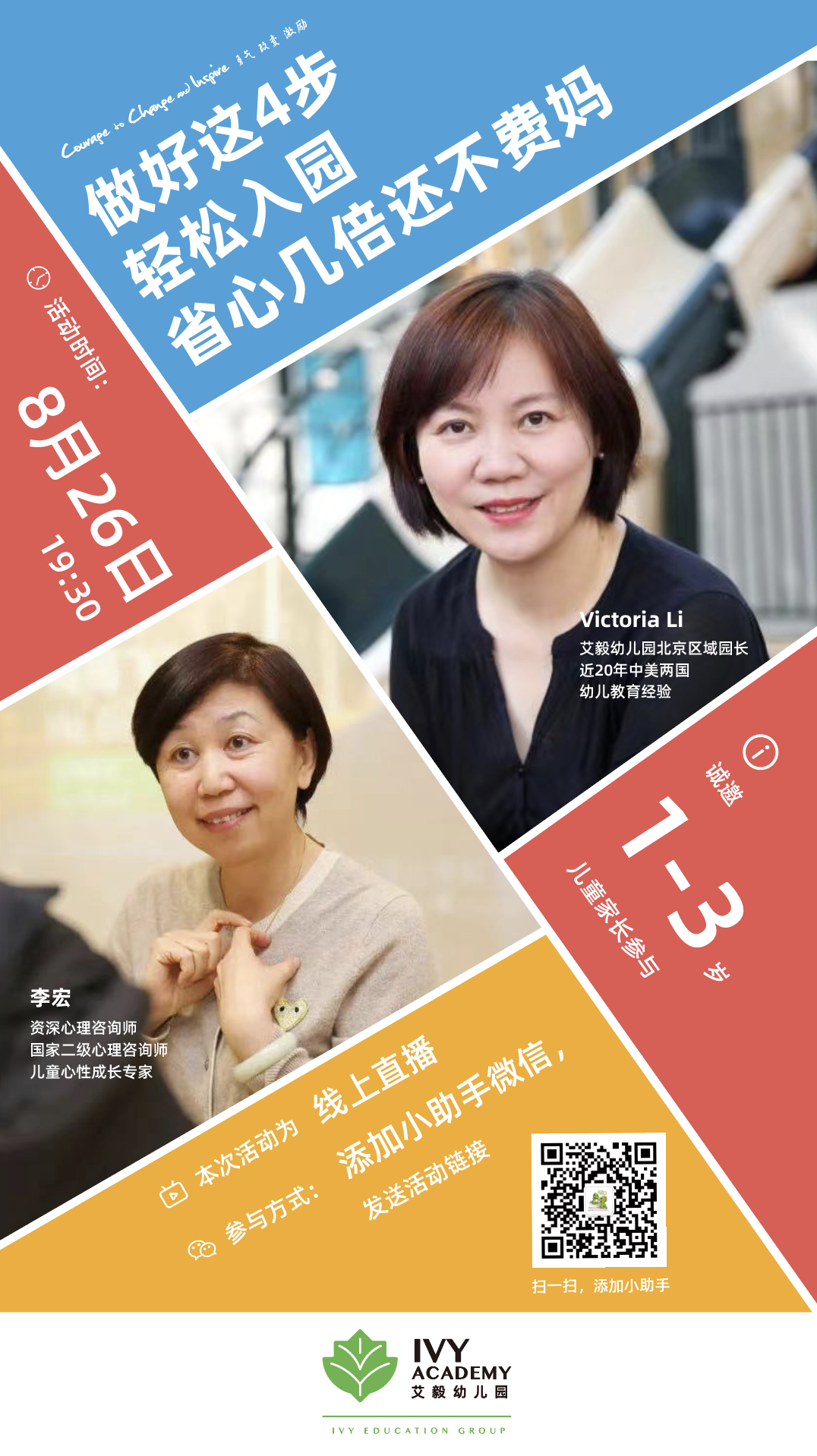 为此,艾毅幼儿园三元桥园特别邀请了艾毅幼儿园北京区域园长Victoria对话资深心理咨询师李宏,于8月26日(周四)晚7:30 举行主题为“做好这四步,孩子开心入园,省心几倍不费妈”的线上讲座。